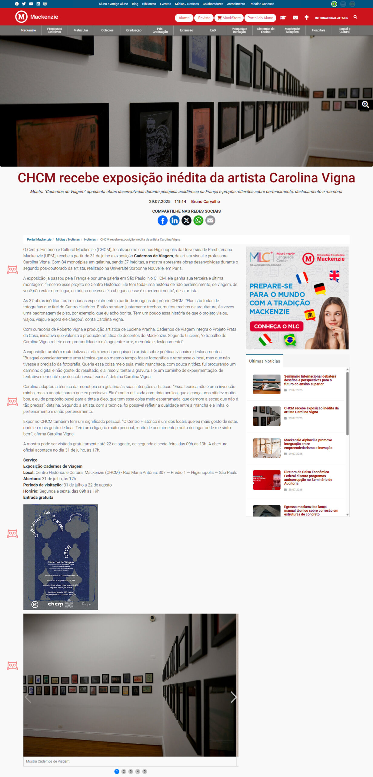 O Centro Histórico e Cultural Mackenzie (CHCM), localizado no campus Higienópolis da Universidade Presbiteriana Mackenzie (UPM), recebe a partir de 31 de julho a exposição Cadernos de Viagem, da artista visual e professora Carolina Vigna. Com 84 monotipias em gelatina, sendo 37 inéditas, a mostra apresenta obras desenvolvidas durante o segundo pós-doutorado da artista, realizado na Université Sorbonne Nouvelle, em Paris.